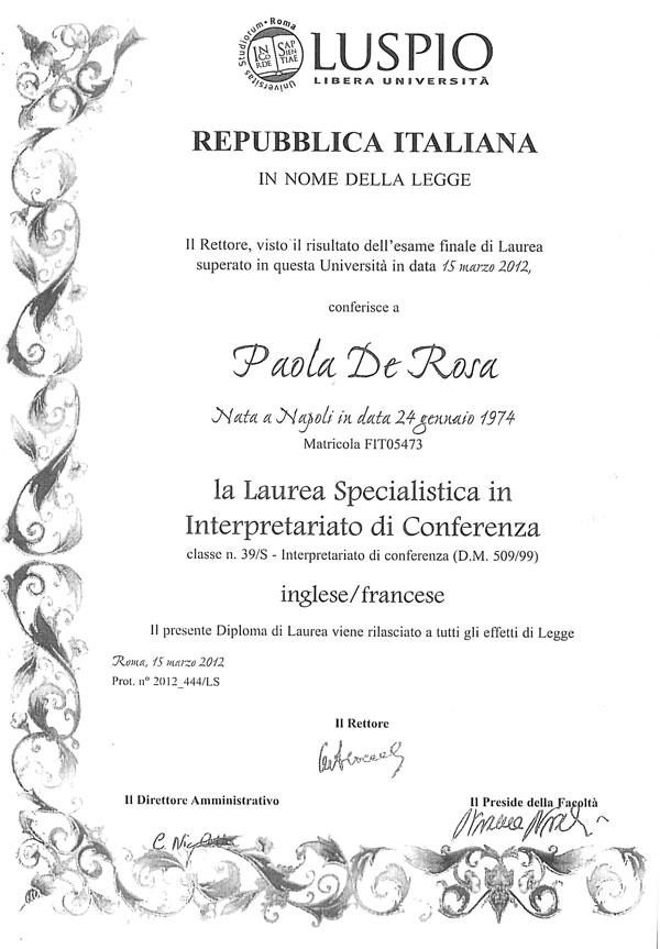 - Master en interprétation de conférence. Université LUSPIO – 2012