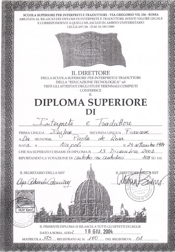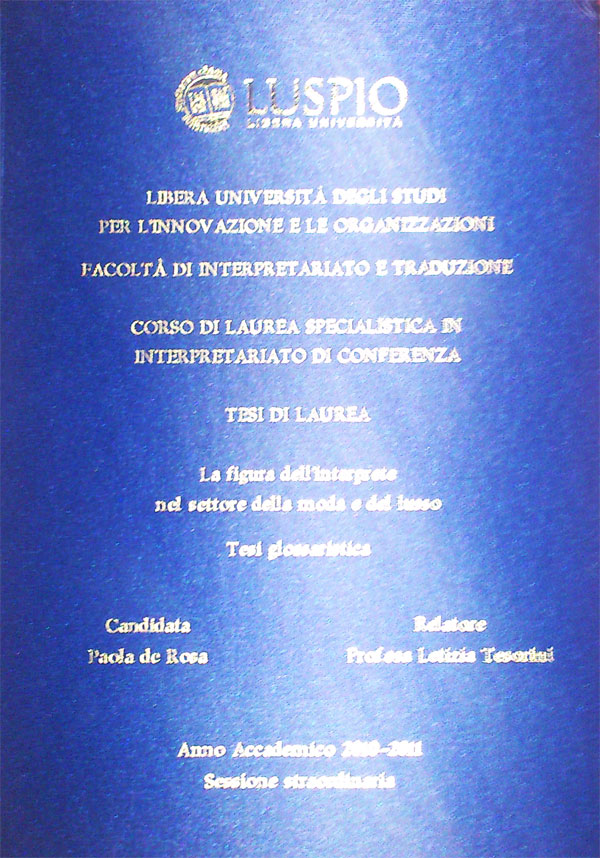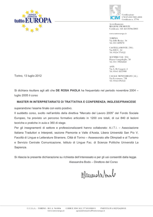 - Master en interprétation de conférence et liason de l’université de Trieste, organisé par l’agence TuttoEuropa à Turin – 2004-2005